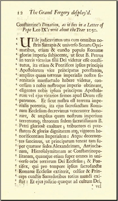 «Но чтобы исключить», - говорит Лев, - «любое сомнение, которое, может быть, все еще остается у Вас относительно земного Первенства (которое остается за папством), чтобы вы более не сомневались в непоколебимости тех доказательств, которые имеет Римский Престол для защиты своей Чести и Славы от глупых россказней, мы представим здесь некоторые из Привилегий, которые были утверждены рукой самого Константина… они послужат утверждению Истины… мы не сеем ученых премудростей, но несем вам слово и силу Нашего Господа Иисуса Христа [2 Петр. 1:16], … Знайте, что этот прославленный правитель в вышеизложенной Привилегии сделал … это провозглашение специальным Даром Римской Церкви» (стр. 18,19)