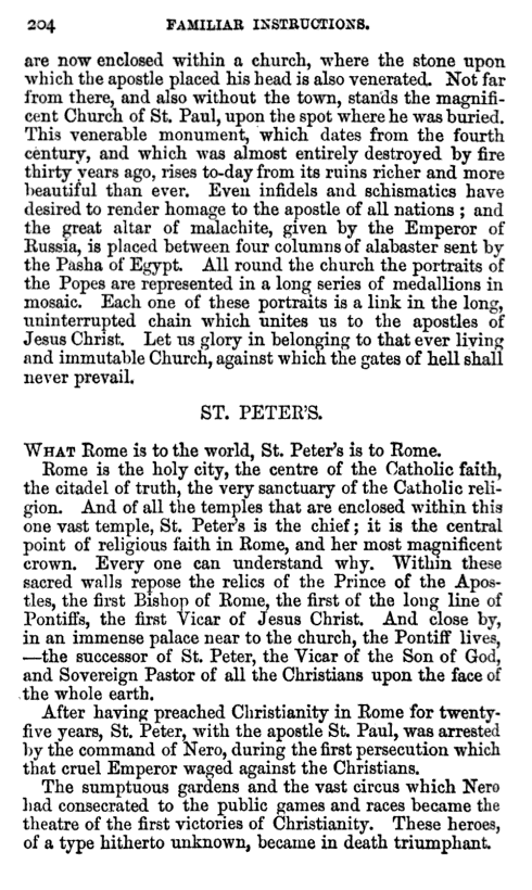 «То же, что Рим значит для мира, Святой Пётр значит для самого Рима. Рим – это священный город, центр католической веры, цитадель правды, основное святилище Католицизма. Все его храмы собраны под сенью одного грандиозного храма, Храма Святого Петра. Это центр веры в Рим, его великолепная корона. Каждый без труда поймет, почему. Внутри этих священных стен хранятся реликвии Государя Апостолов, первого епископа Рима, первого из длинного ряда Понтификов, первого Наместника Иисуса Христа. А рядом с храмом, в огромном дворце живет Понтифик — наследник св. Петра, Наместник Сына Божьего, и Верховный Пастор для всех христиан, населяющих землю.»