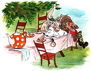 Из сказки Льюиса Кэролла «Приключения Алисы в Стране Чудес», глава VII. Безумное чаепитие. Перевод Нины Демуровой.